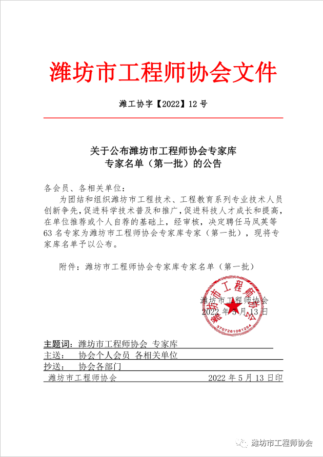 关于公布潍坊市工程师协会专家库 专家..