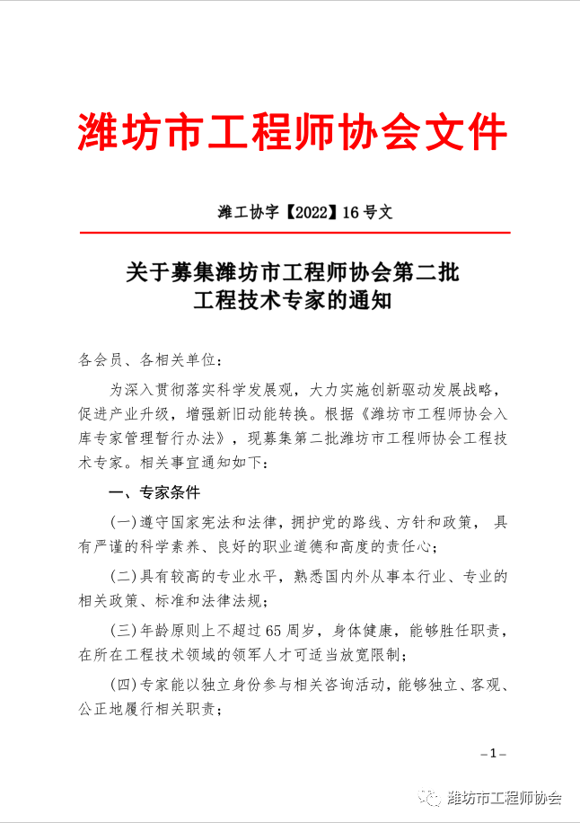 关于募集潍坊市工程师协会第二批工程技术专家的通知